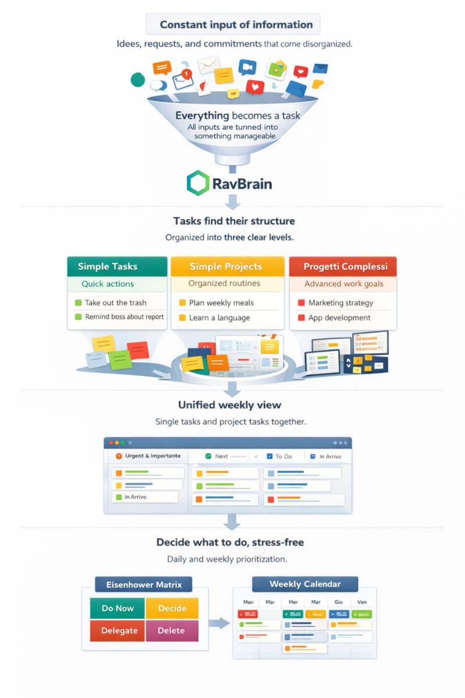 Below, you’ll find a visual summary of how RavBrain turns overwhelming inputs into focused, actionable decisions — day after day.